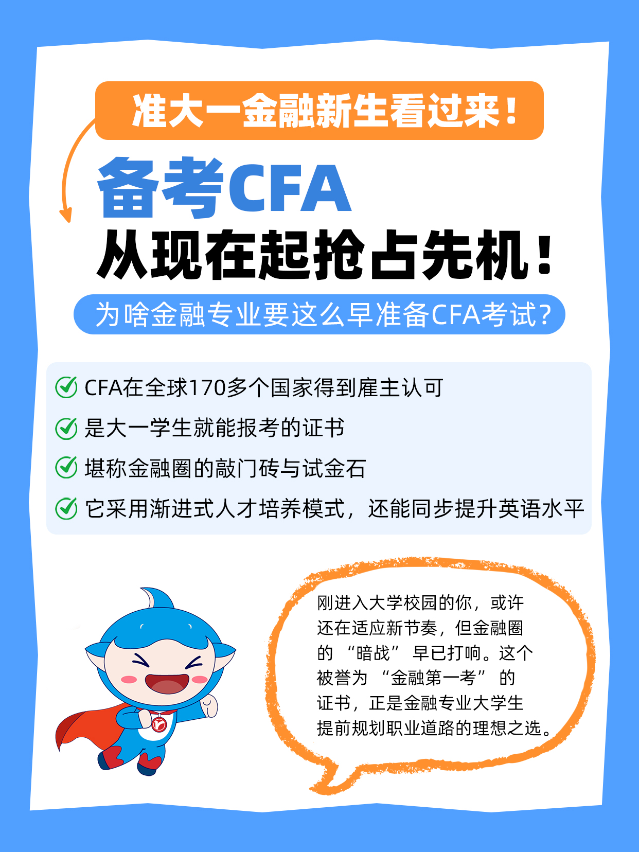 ✅报考政策适配:CFA 允许毕业前 11 个月报名,也就是说大二暑假就能报一级,完全有机会在毕业前拿下证书,给简历添个硬核亮点!